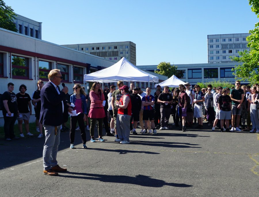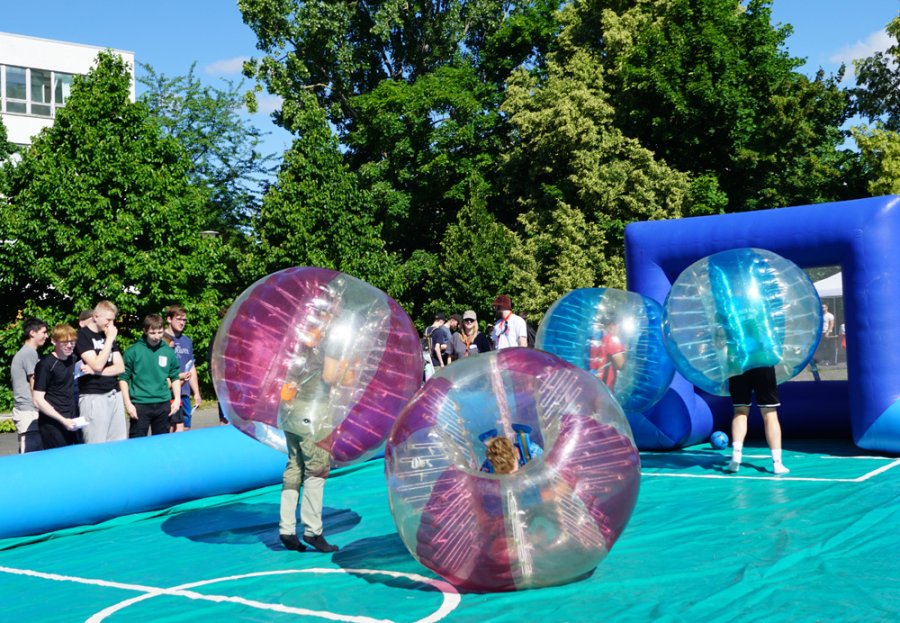 Bereits in der 10. Auflage hat am heutigen Donnerstag (19.06.2025) das beliebte SportsDiscovery auf unserem Schulgelände stattgefunden. Dabei wurden so originelle Sportarten wie “BubbleSocccer”, Pedalbrett, Bungeerun oder Stelzenlaufen angeboten, aber auch Stände der SaaleBulls, Torwandschießen des HFC, Thaiboxen oder Schach rundeten das Angebot ab. Neben den Auszubildenden unserer Schule waren zahlreiche Schülerinnen und Schüler von anderen Sekundar- oder Berufsschulen mit am Start. Ein stimmungsvolles und gut organisiertes Event, vielen Dank unter anderem auch an die Schulsozialarbeit von St. Georgen.